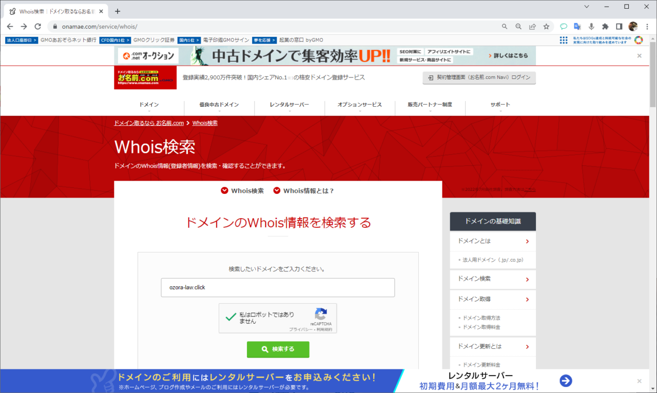 ここでは、Whois検索|ドメイン取るならお名前.com(https://www.onamae.com/service/whois/)を使って調べます。検索したドメインを入力して、ロボットではありませんにチェックしたら、検索するボタンを押してください。「https://」や「/」はつけないでください。例)ozora-law.click