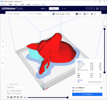 ENDER3で大きな造形を実践する。パーツが頭部、角部、マウントの3部品に分割されているのでENDER3の実サイズより大きなものが作成できる。元データでもっとも大きいのは頭部です。ぎりぎりの130%サイズまで拡大して作成する。鹿を選んだ理由は、話題作りです。Zoomでビデオ会議したときに背景に鹿の頭があると印象に残る。私が尊敬する神田昌典先生がビデオ配信で背後に鹿の頭部らしい飾りがあったので、いつか私の動画配信で鹿なのか聞かれたら先生の真似をしたと言いたいし、歯科向けの仕事をしているというダジャレになっている。